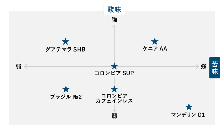 各コーヒーの味わいの違いについては下図を参照いただくか、こちら↓をご確認ください。