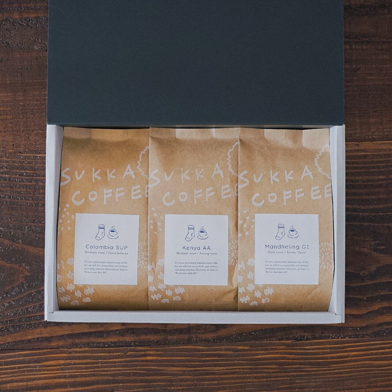 当店で取り扱っているコーヒー6種類の中から、ご自由にお選びいただいた3種類を100gずつクラフトバッグに入れ、詰め合わせたギフトセットです!